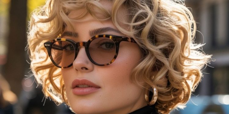 This look radiates confidence. The golden curls are cut into a loose bob, allowing bounce and volume without overwhelming the face. The oversized tortoiseshell sunglasses and houndstooth blazer instantly elevate the cut, giving it a street-style edge perfect for city walks, creative office jobs, or casual weekend outings. The cut is ideal for women’s oval faces, though rounder face shapes might find it adds width unless balanced with layers or a side part.
