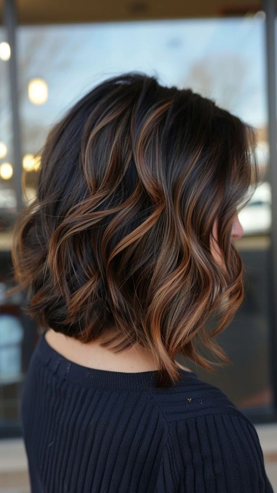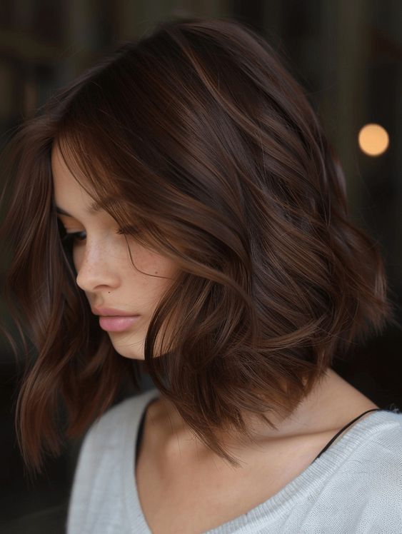 This soft, wavy bob is ideal for those looking for a low-maintenance yet chic hairstyle. The medium brown color with subtle highlights adds a beautiful dimension. Suitable for heart-shaped and oval faces, this look is perfect for everyday elegance.
