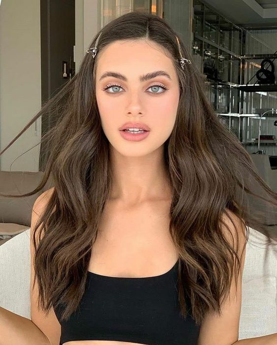 These voluminous waves bring a playful and romantic vibe, accented with simple hair clips. The medium brown shade is universally flattering and adds a touch of softness to the overall look. Perfect for round and square face shapes, this hairstyle is practical for both casual and semi-formal events.