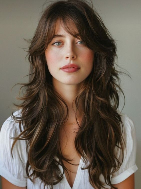This style features long, straight hair with bangs, creating a light and airy feel. The dark brown shade is deep and rich, perfect for fall. This hairstyle suits those with oval and heart-shaped faces, offering versatility for various occasions.