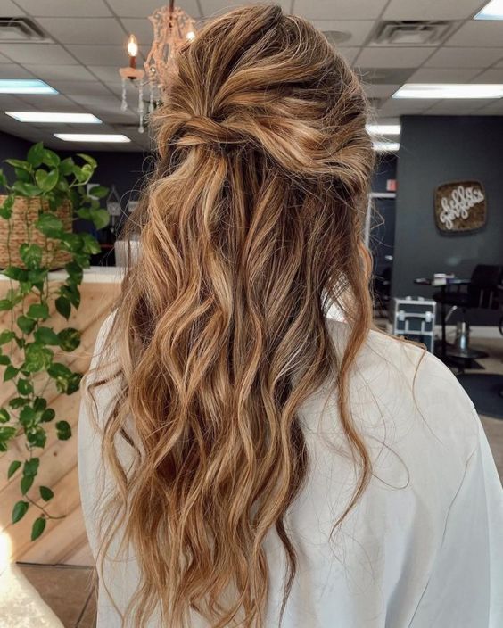 The half-up, half-down style is a perfect blend of casual and elegant, making it a versatile choice for wavy hair.