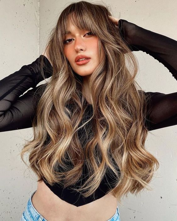 Long wavy hair paired with bangs creates a youthful and trendy look. The waves add volume and texture, while the bangs frame the face beautifully.