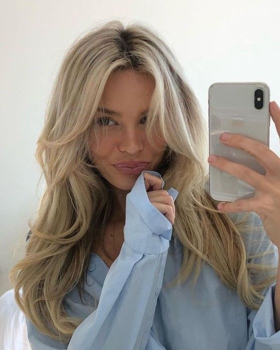 - Her hair color is a warm blonde with darker roots, adding depth and dimension.