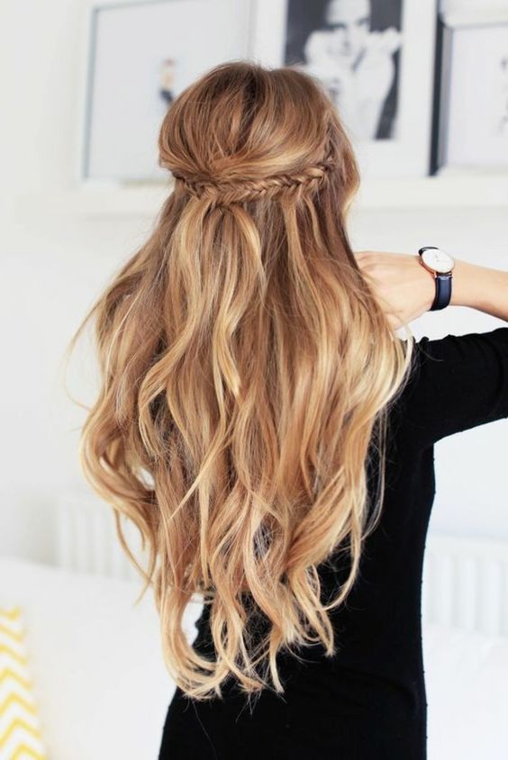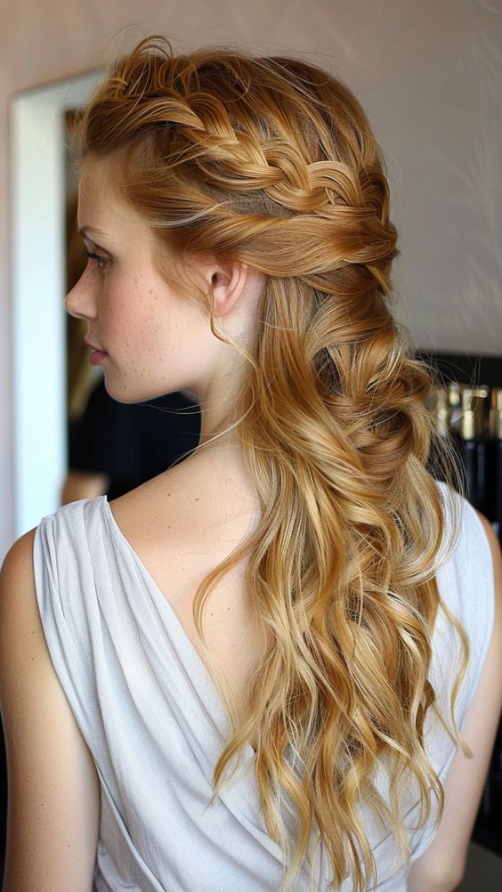 The braided half-up style combines the best of both worlds: the elegance of braids and the natural beauty of wavy hair. This style is ideal for both casual outings and more formal events.