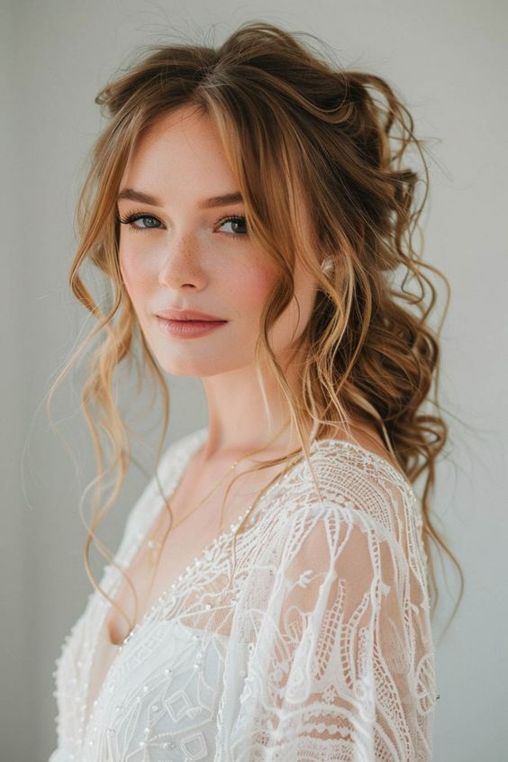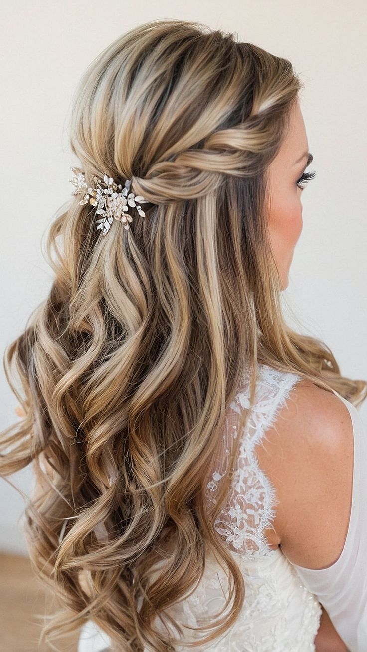 This half-up, half-down hairstyle combines the best of both worlds, offering the structure of an updo with the freedom of loose waves. It’s perfect for brides who can’t decide between an updo and leaving their hair down.