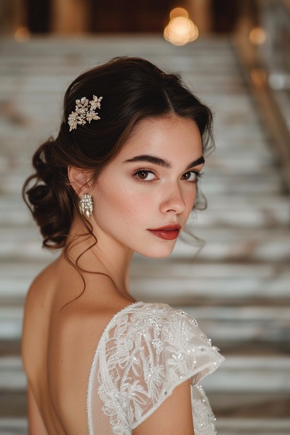 This romantic updo with soft, pinned curls and a decorative hairpiece is perfect for brides aiming for a vintage-inspired look. It’s a versatile style that pairs well with various dress silhouettes.