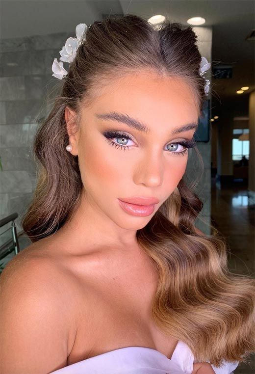 For brides who want a balance between updo and down, this glamorous half up hairstyle with floral accents is ideal. It combines sophistication with a touch of whimsy.