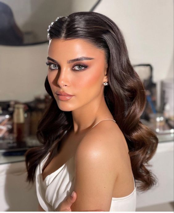This sleek, side-parted hairstyle with soft waves is the epitome of sophistication. The smooth texture complements a minimalistic dress design, making it a fantastic choice for a chic, modern bride.