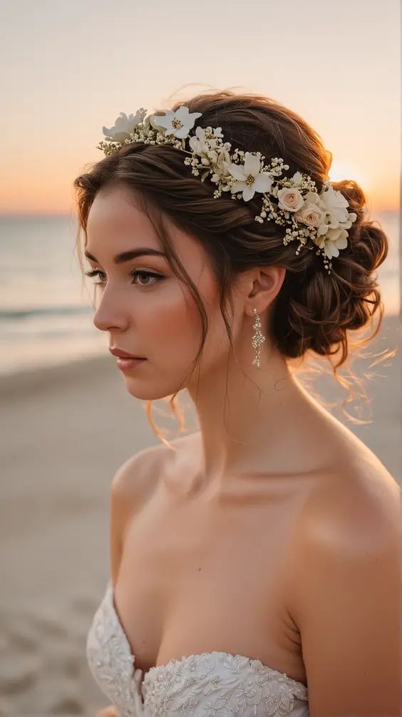 - Floral headpiece: A delicate floral headpiece enhances the beachy vibe, adding a touch of natural beauty.