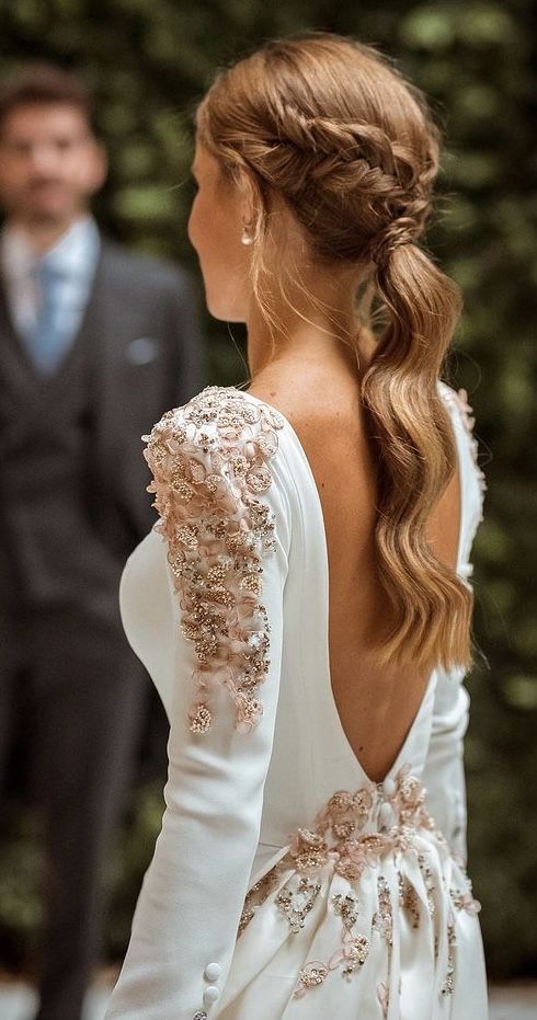This hairstyle exudes timeless elegance with its intricate braids leading into a voluminous ponytail. Perfect for the bride who wants to combine tradition with modernity, this look is ideal for showcasing the beautiful details on the back of a wedding gown.
