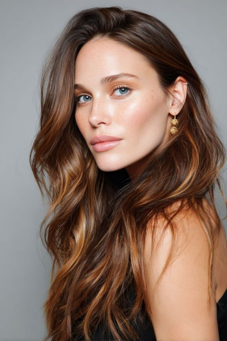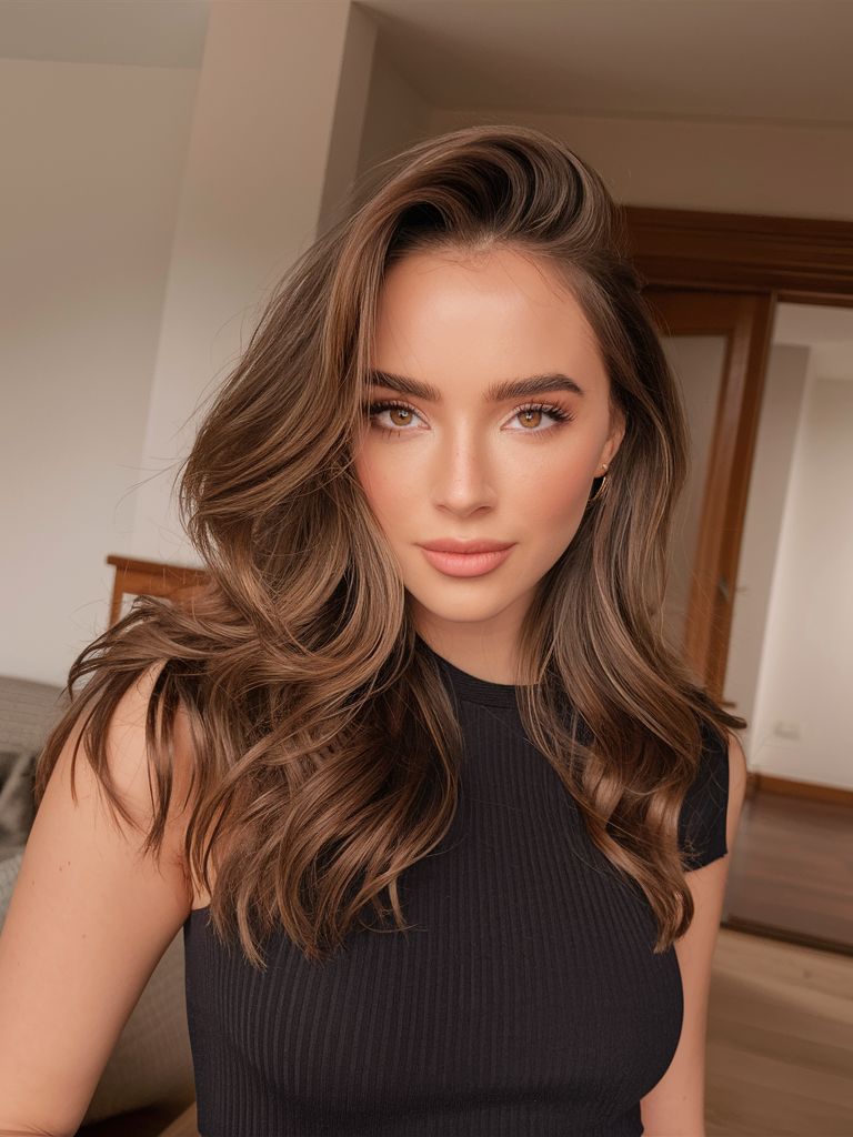 This style embraces a classic brunette base with delicate caramel tones melting through. The look is versatile: soft enough for casual brunches, yet polished for formal events. Best suited for women with long hair or medium hair, and it flatters oval faces the most. Those with thin hair can still pull it off by adding texture with styling mousse. It’s not as dramatic as platinum, but it delivers understated elegance for 2025.