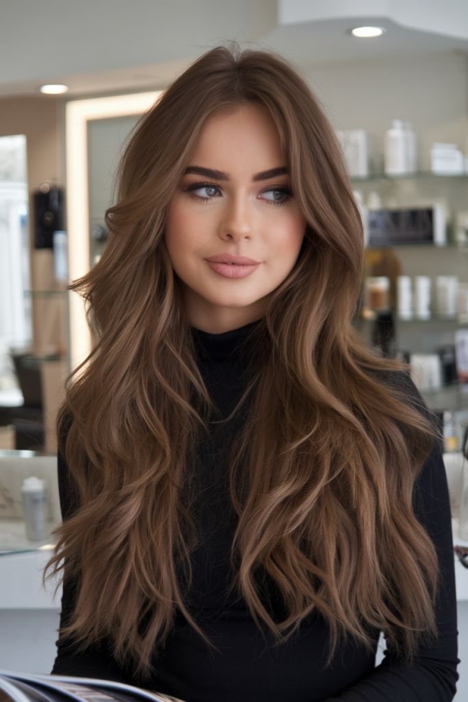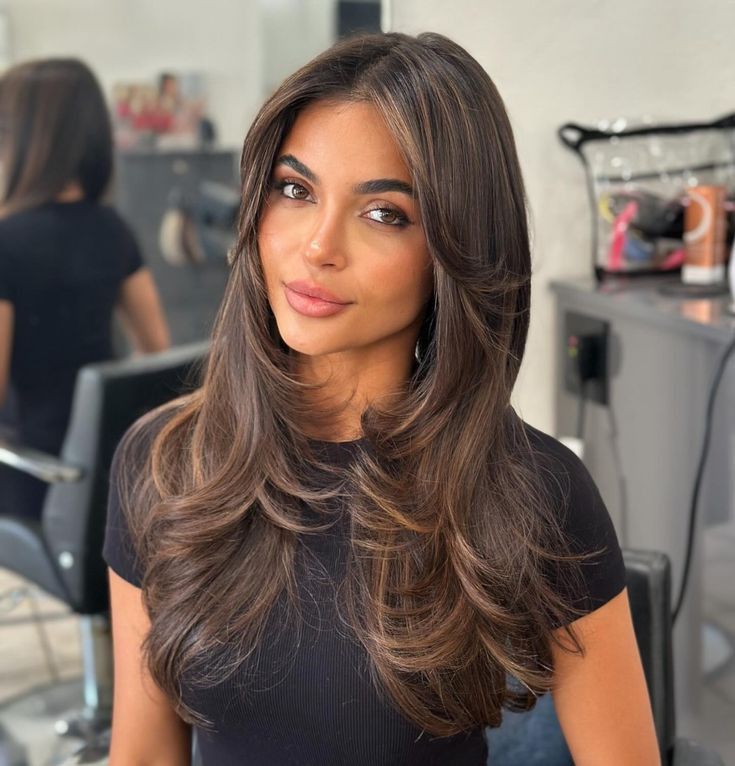 This look embodies pure glamour — cascading long hair layers with a voluminous blowout finish. The deep brunette tone with subtle highlights enhances shine and adds dimension. It’s perfect for women with thick hair or fine hair who want body and bounce. Styled with a middle part, it flatters oval face shapes and elongates round face contours.