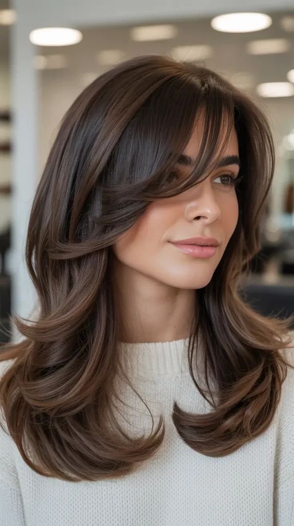 This style leans into cooler brunette shades, complemented by sleek, face-framing bangs that sweep naturally across the forehead. The layering is intentional, giving structure while maintaining softness. It’s a haircut well-suited for square face shapes, as the bangs help soften angular features. Perfect for winter, this cut feels refined yet modern, especially on women who prefer straight hair or smooth wavy textures.