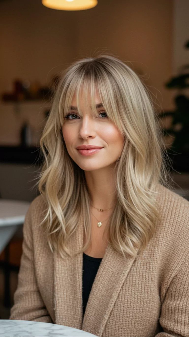 This hairstyle brings together soft, undone waves with feather-light bangs that skim the brows. The creamy blonde shade is bright yet cozy, a dreamy fit for winter light. It’s a universally flattering cut that suits both round face and oval face shapes, adding openness through the forehead area. The wispy bangs add youthfulness and a touch of French-girl chic — effortlessly modern.