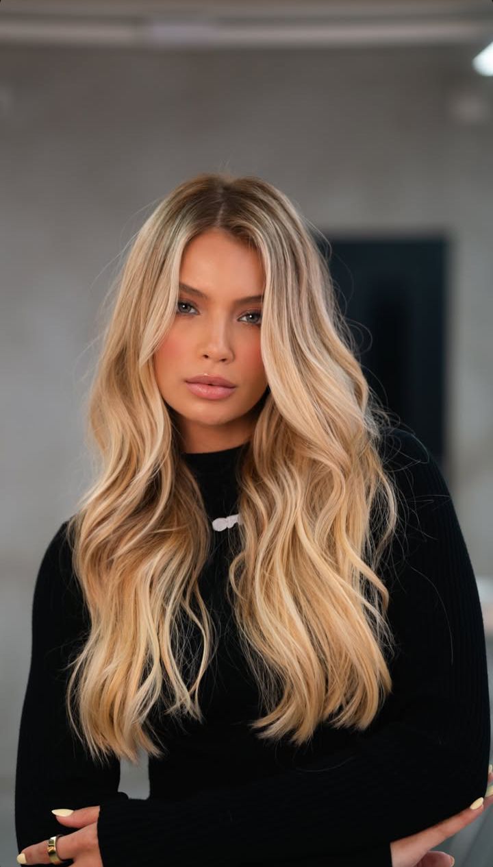 Here we see long hair styled in full, beachy wavy hair layers. The center part keeps the look modern, while the color — a buttery blonde blend with lighter ends — creates dimension that’s flattering in winter light. This haircut works especially well for women with thick hair, as the layering lightens the weight while maintaining fullness. It’s a universally glamorous look.