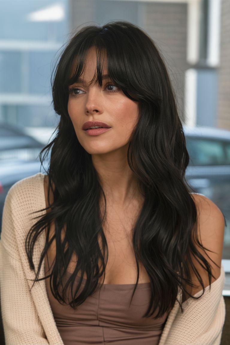 A timeless dark brunette leaning toward jet black, paired with subtle curly hair-inspired waves. The curtain bangs soften the overall intensity of the dark color, making it suitable for oval face shapes and round face contours. This haircut thrives on shine — it’s best for women with straight hair or wavy hair long enough to carry movement.