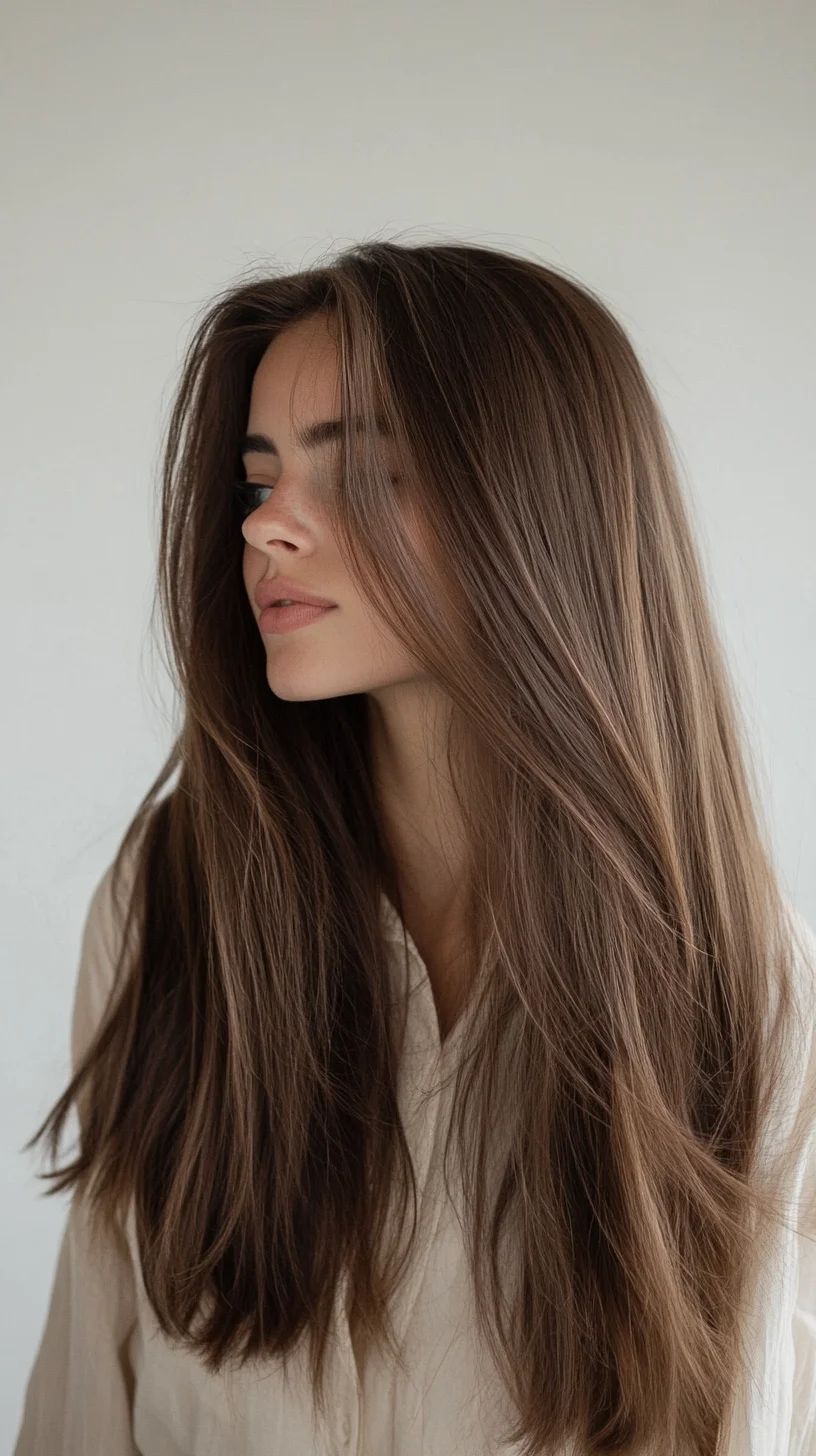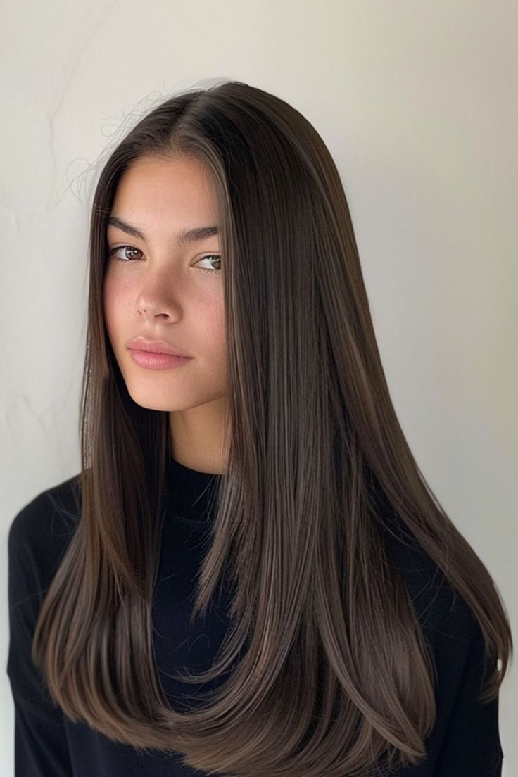 There’s something powerful about keeping hair long and uniformly dark. This style takes a nearly jet-brown tone and shapes it with clean layers around the ends, maintaining a sense of movement while staying structured. It’s a flattering look for longer faces and those who want hair to act almost like an accessory—sleek, strong, and commanding. For winter, it’s an understated yet confident choice.