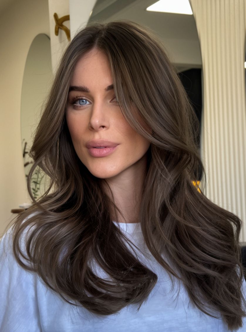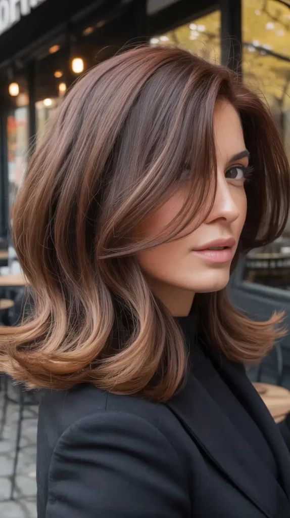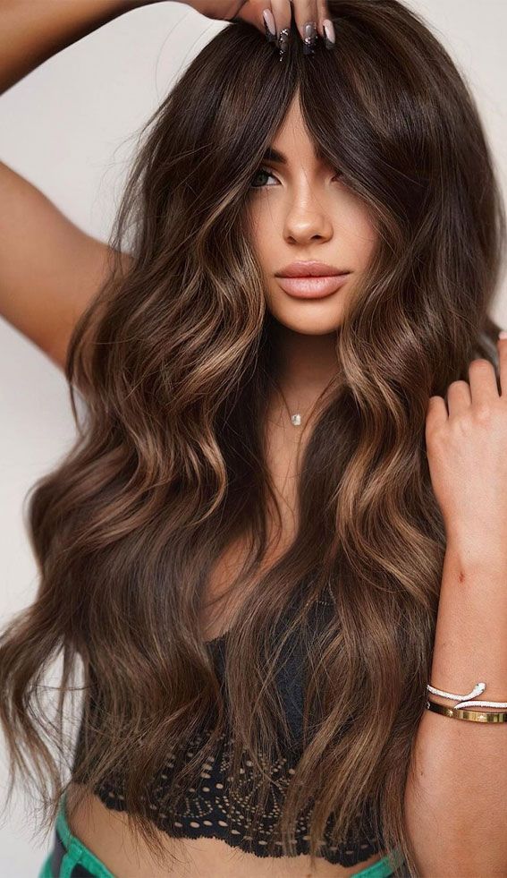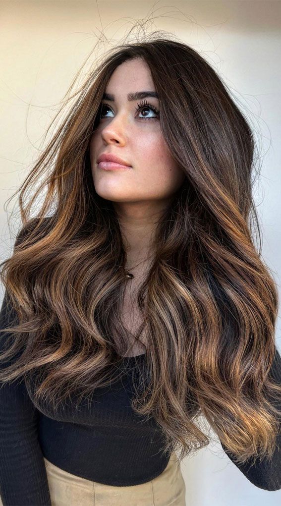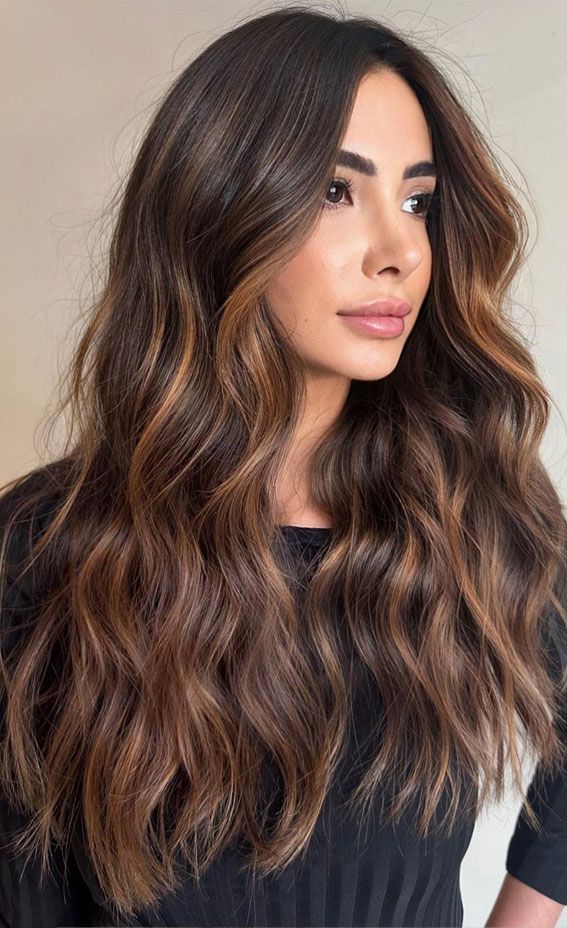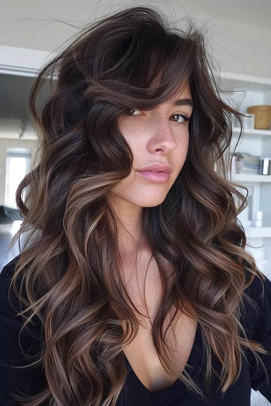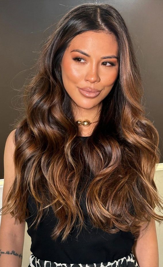 Long, cascading waves showcase a luscious brunette base enriched with delicate balayage strokes in warm toffee and chestnut. The style flatters oval and heart-shaped faces especially, elongating the silhouette. It’s versatile enough for everyday wear yet glamorous enough for evening outings, perfect for fall and winter transitions when your hair needs to mirror both coziness and elegance.