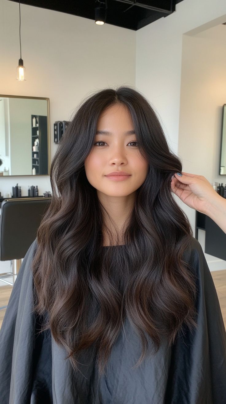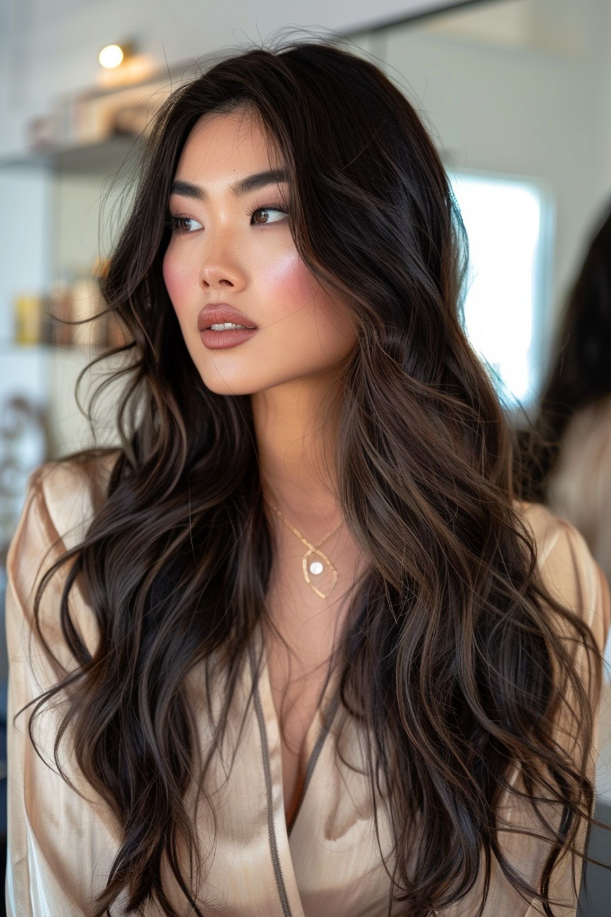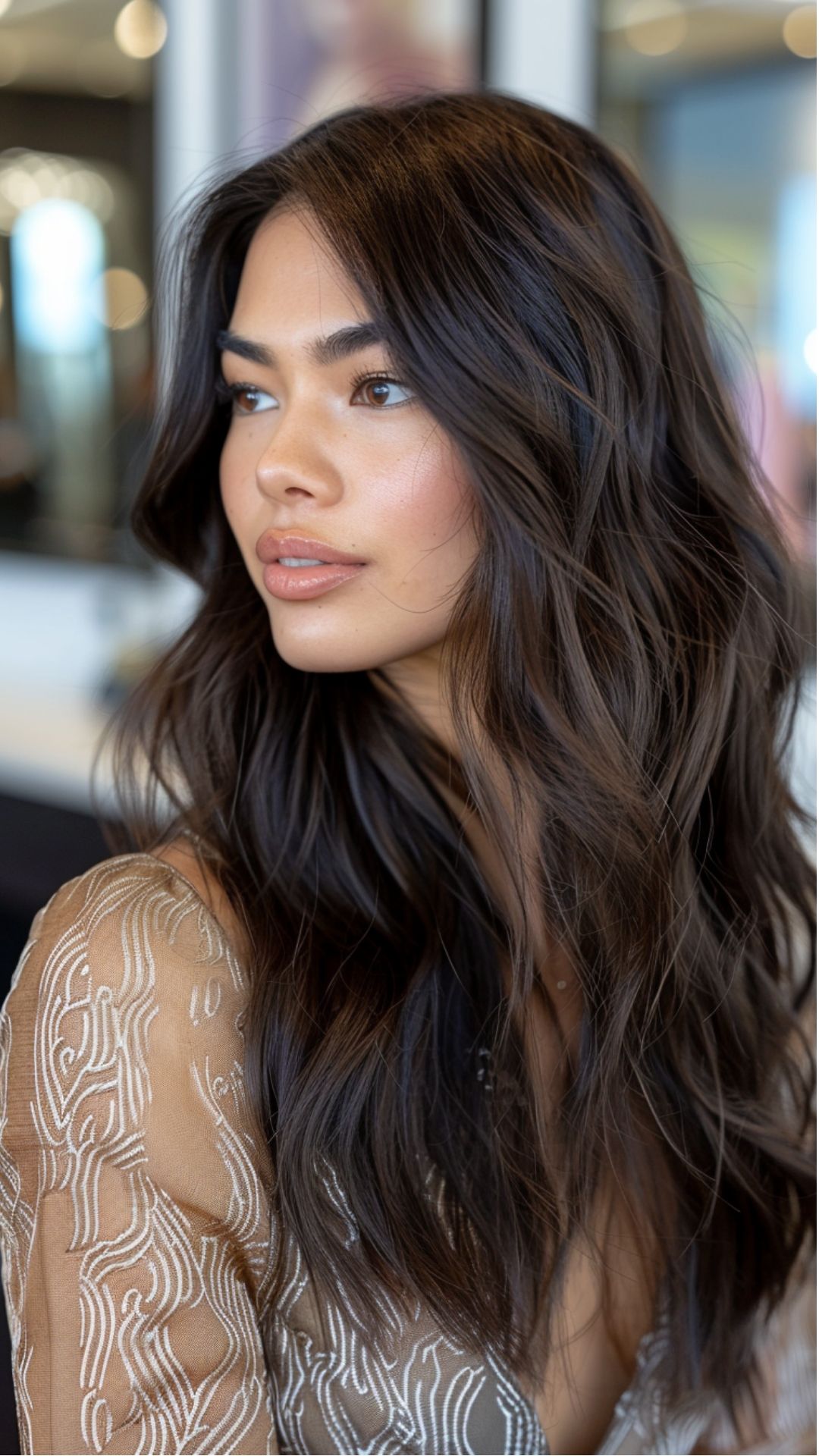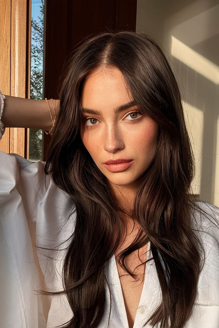 Long dark brunette hair styled in flowing waves—this look is minimal yet undeniably striking. It’s versatile enough for both professional and casual settings, and it frames the face beautifully.