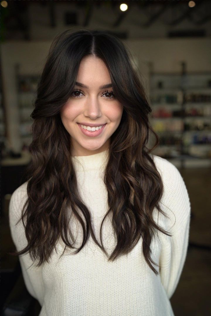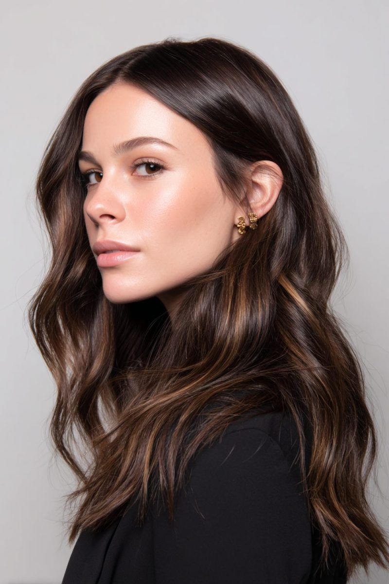 This brunette radiates warmth through soft caramel highlights woven seamlessly into long waves. It’s a perfect fall-to-winter crossover look, keeping brightness while still embracing the season’s coziness. Works particularly well for olive skin tones.