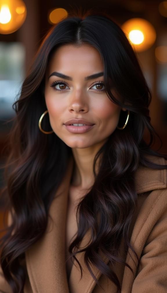 Closing with a dramatic dark brunette look—long, polished waves paired with chic makeup and accessories. This style is statement-making, perfect for glamorous evenings. It suits olive and deeper skin tones particularly well.