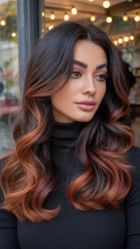 This look takes winter hair into daring territory with rich dark roots melting into coppery red peekaboo ends. It’s bold, stylish, and wonderfully expressive—ideal for nights out, creative industries, or anyone craving a fun twist. It may be less suited for ultra-formal workplaces, but perfect for self-expression in 2025.