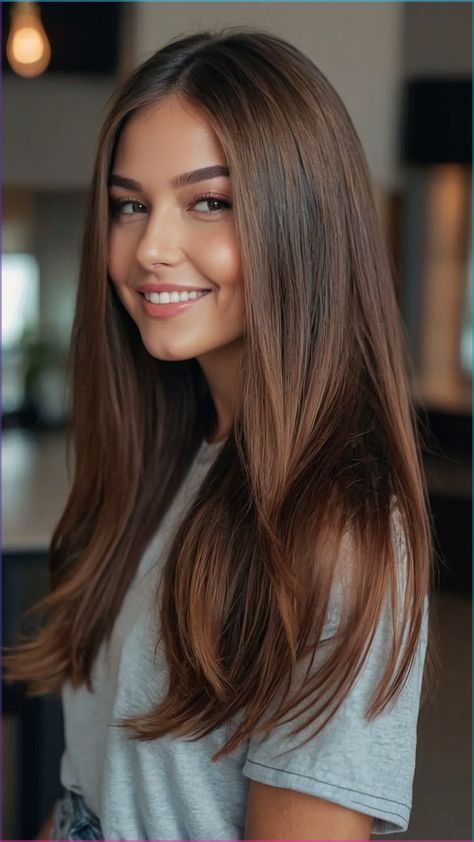 Sometimes, nothing beats the beauty of straight hair. This long chestnut brunette is glossy, refined, and easy to maintain with the right smoothing products. Its simplicity makes it a go-to for women who prefer minimal fuss and want a look that transitions easily from professional settings to evening dinners. On pale skin, this soft chestnut tone adds warmth without overpowering.