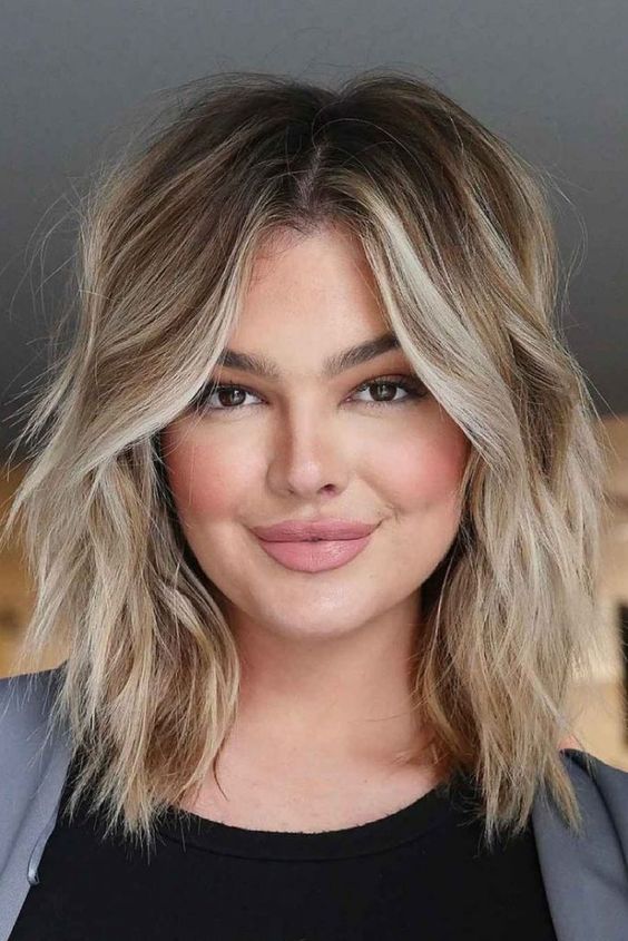 Honey blonde is a classic winter color that adds a touch of brightness to any look. This wavy, shoulder-length style adds volume and texture, which is perfect for softening the features of round faces while keeping it playful and casual.