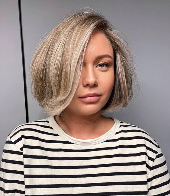 This ash blonde bob with a deep side part is perfect for creating an asymmetrical balance, drawing attention away from the roundness of the face and giving it a more structured look. The cool blonde shade contrasts well with winter’s muted tones and complements fair to medium skin tones beautifully.