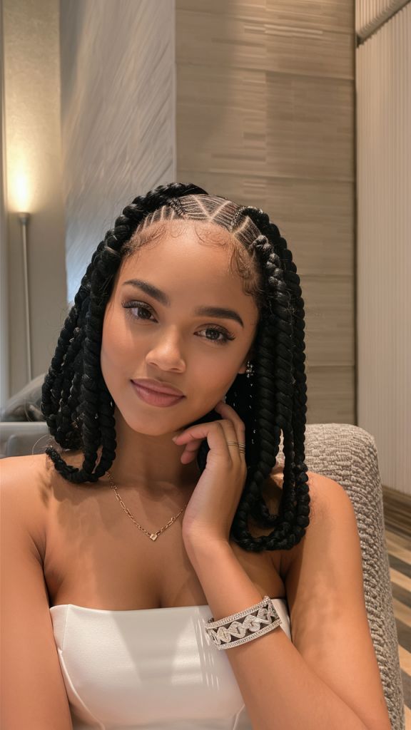 A bob of chunky rope twists with crisp, geometric parting—sleek, moisturized, and softly curled at the ends. The strapless white top and delicate gold jewelry make the style feel evening-ready without trying. Practicality is the win here: twists tuck easily into coats and won’t mat under scarves. Great on oval and heart faces; if your frame is very petite, ask for slightly slimmer partings so the bob doesn’t overpower. Perfect for dinners, office parties, and Simple day-to-night Ideas.