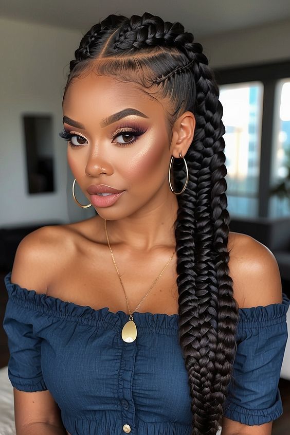 Thick, neatly styled cornrows African Americans form a crown that sweeps into long braids, pulled over one shoulder for dramatic effect. It’s protective yet stylish, perfect for keeping hair secured in harsher climates while maintaining high-fashion impact. This look suits square and oval face shapes especially well, accentuating jawlines. It’s a quick and practical choice for women on the go, from workdays to evening outings.