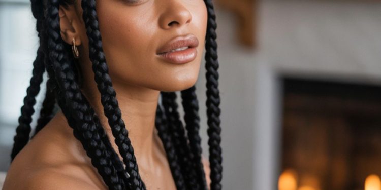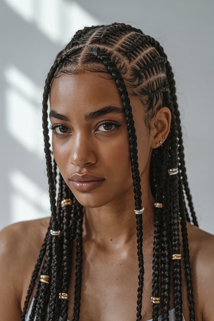 Long natural braids styled into box braids, decorated with metallic beads for understated flair. This hairstyle is protective, low-maintenance, and ideal for women balancing busy schedules in the colder season. It works beautifully with angular or elongated face shapes, softening features while remaining bold. The beads elevate the braids into something festival-ready but still practical for everyday wear.