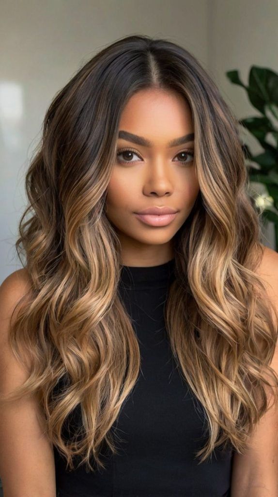 Here’s a stunning take on blonde dyed hair Black women trends: loose waves in balayage tones that transition seamlessly from dark roots to lighter golden tips. The style balances skin tone hair color Black women ideas perfectly, giving warmth without overwhelming natural undertones. This hairstyle works well for older women hairstyles too, offering youthful radiance while keeping things classy.