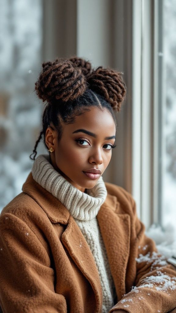Chunky braids faux locs styled into twin buns make a playful yet protective winter option. The earthy aesthetic pairs beautifully with cozy textures, like this camel coat and ribbed turtleneck, grounding the whole look in winter comfort. It’s practical too: loc buns keep hair tucked away from harsh winds and snow. Perfect for casual strolls, cozy coffee shop dates, or weekends in the mountains. Not so ideal for formal work meetings, where sleekness might feel more fitting.