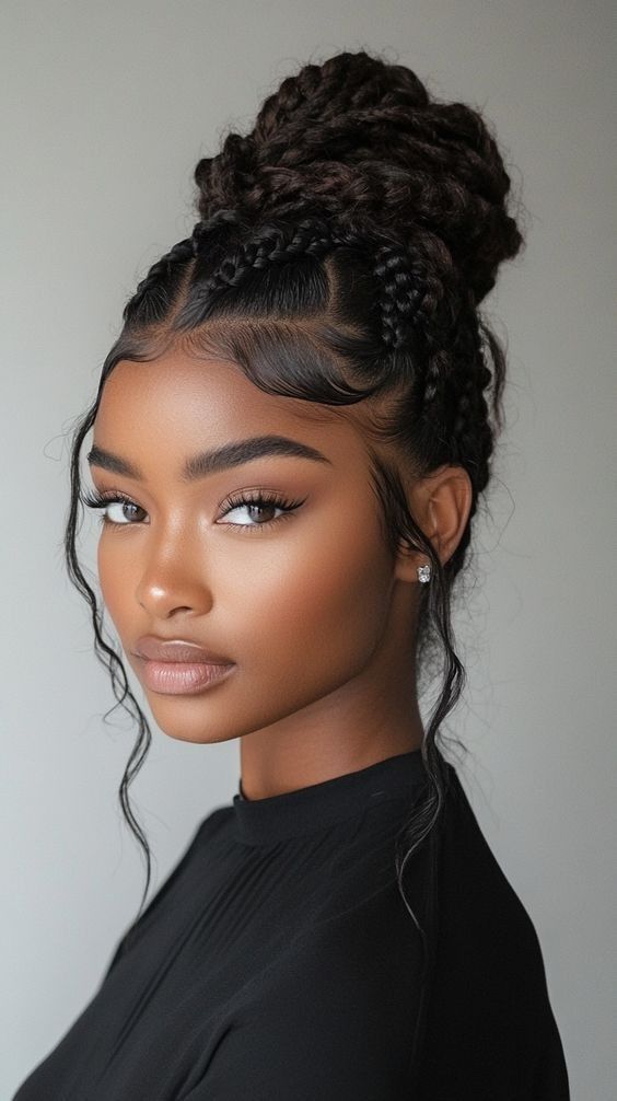 A sculpted topknot built on fine Cornrows with snatched edges and soft tendrils—elevated but comfortable. It’s the definition of Natural updo meets red-carpet minimalism. Works beautifully for coats with high collars and turtlenecks because the neck is clean. Ideal for dressy events, gallery nights, or a winter wedding guest look; less ideal for helmets or beanies (flattening risk).