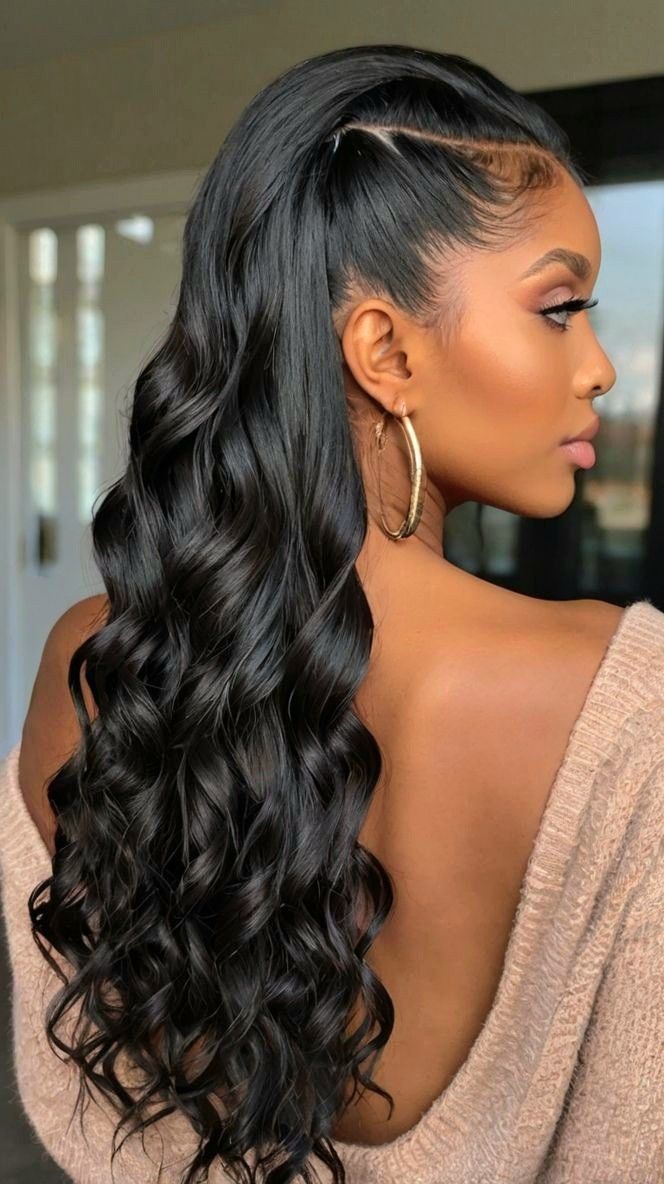 Long, flowing curls gathered into a high ponytail create movement and drama that fits both festive and everyday winter looks. The style’s shine and bounce are a nod to weave braids trends, while the slicked crown keeps things modern. Best suited for taller women or those with longer necklines, since the length draws attention downward. It’s the perfect ponytail for date nights or evening parties, but maybe too impractical for heavy winter gear like thick scarves.
