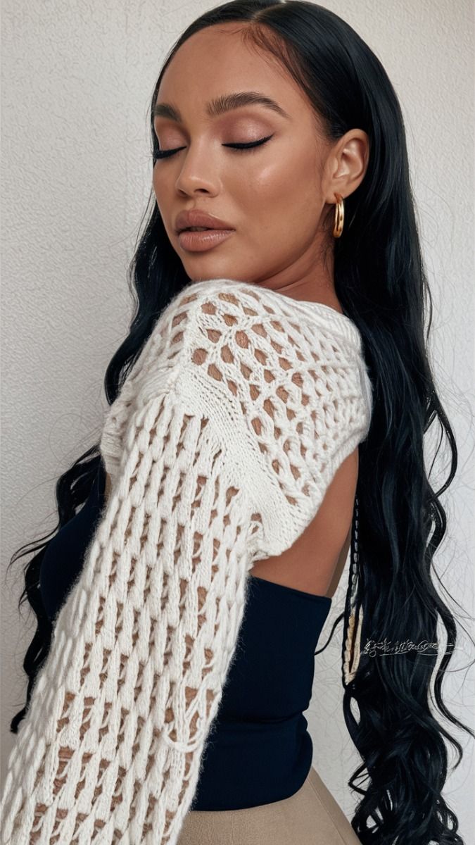 Glass-sheen lengths with a center part, lightly waved at the tips—paired with a crochet-open knit bolero and gold hoops. The contrast of soft knit texture against mirror hair is so 2025. This is an “office to cocktail” win and reads Simple, Cute, and Classy. Great for straight or wavy installs; if your natural length is shorter, opt for a low-tension weave or U-part wig for warmth and scalp access.