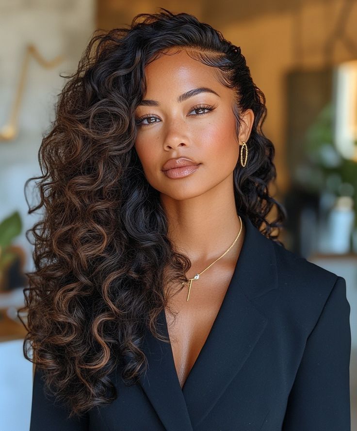 Here we see glossy, voluminous curls cascading effortlessly, styled with a side part that softens the overall silhouette. This hairstyle is timeless and flattering, especially for round or oval faces, as the loose curls frame the face delicately without adding heaviness. Perfect for cocktail parties, work events, or upscale dinners, it’s a classy choice for women who prefer elegance over edge in the colder months.