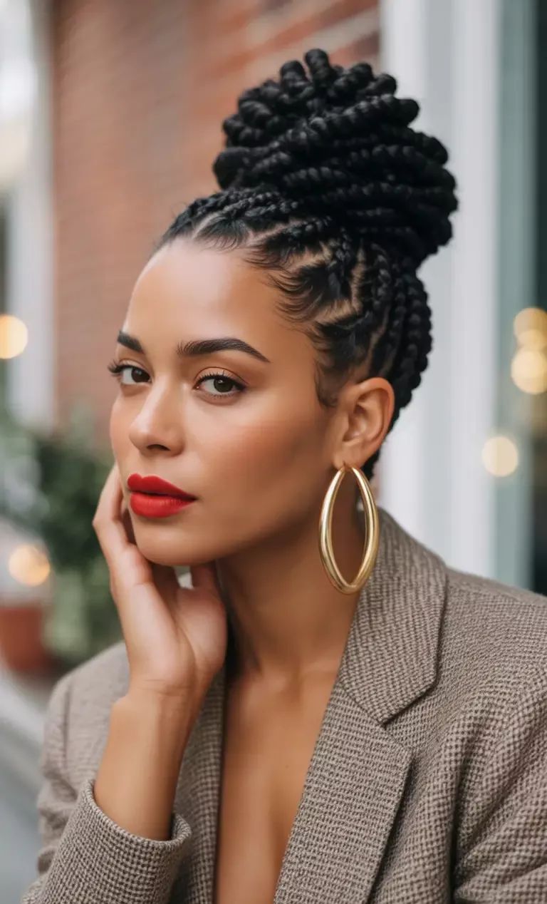 A high, sculptural braided topknot with intricate base work, paired with a tailored blazer, bold red lip, and oversized gold hoops. It’s power-polish meets weekend brunch. The updo clears the neckline for winter layering and won’t collapse under a structured coat hood.