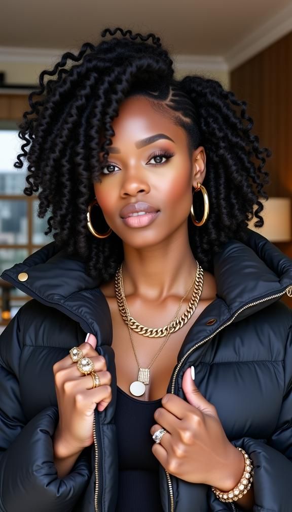 This look features structured, chunky twists styled into a voluminous shape that beautifully frames the face. Paired with statement jewelry—a thick chain, oversized hoops, and stacked rings—the hairstyle radiates confidence and warmth. It works particularly well for oval or heart-shaped faces, emphasizing cheekbones and drawing attention upward. The puffer coat grounds the glam with a cozy touch, making this hairstyle ideal for winter street style, brunch outings, or casual nights where you still want that “main character” energy.