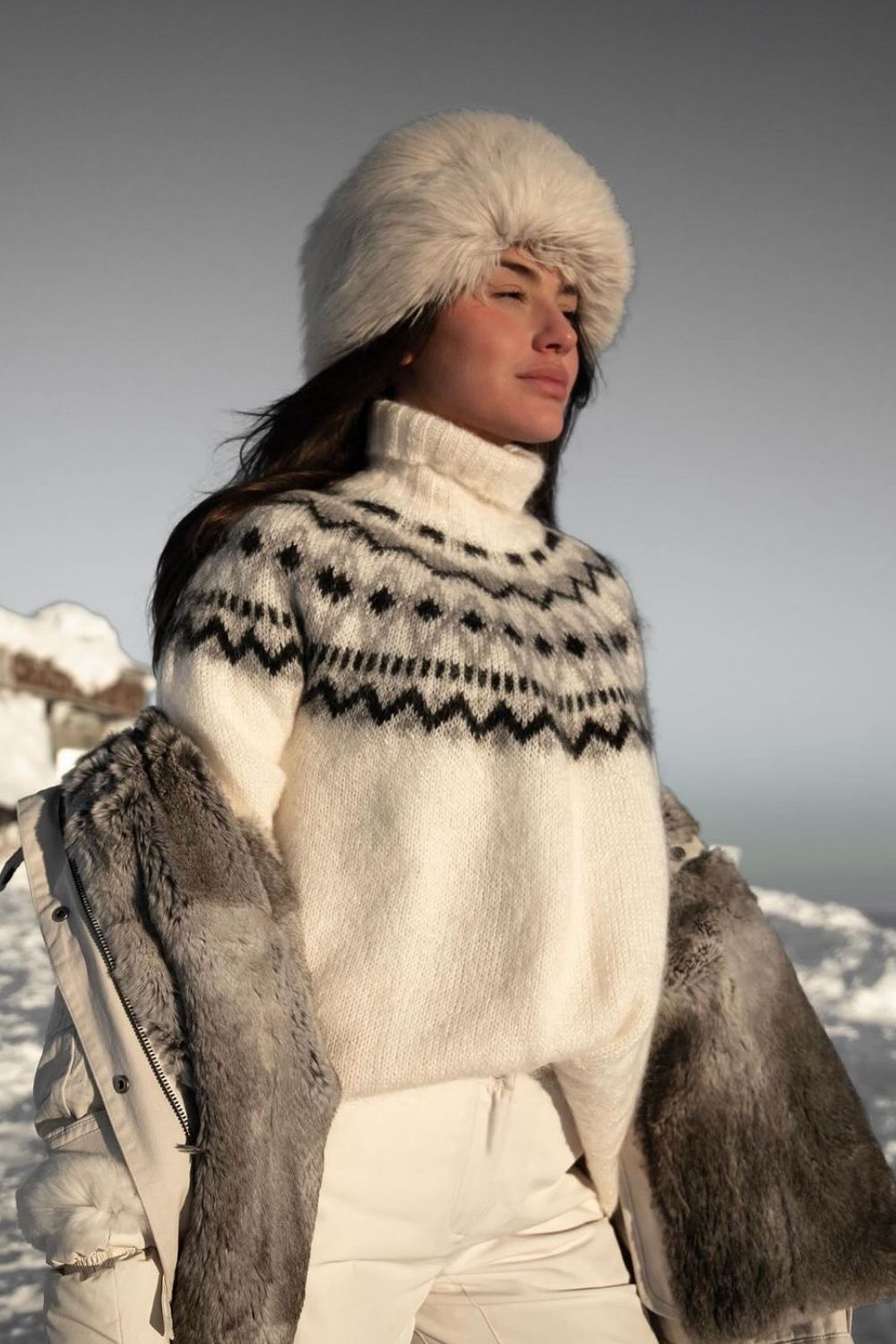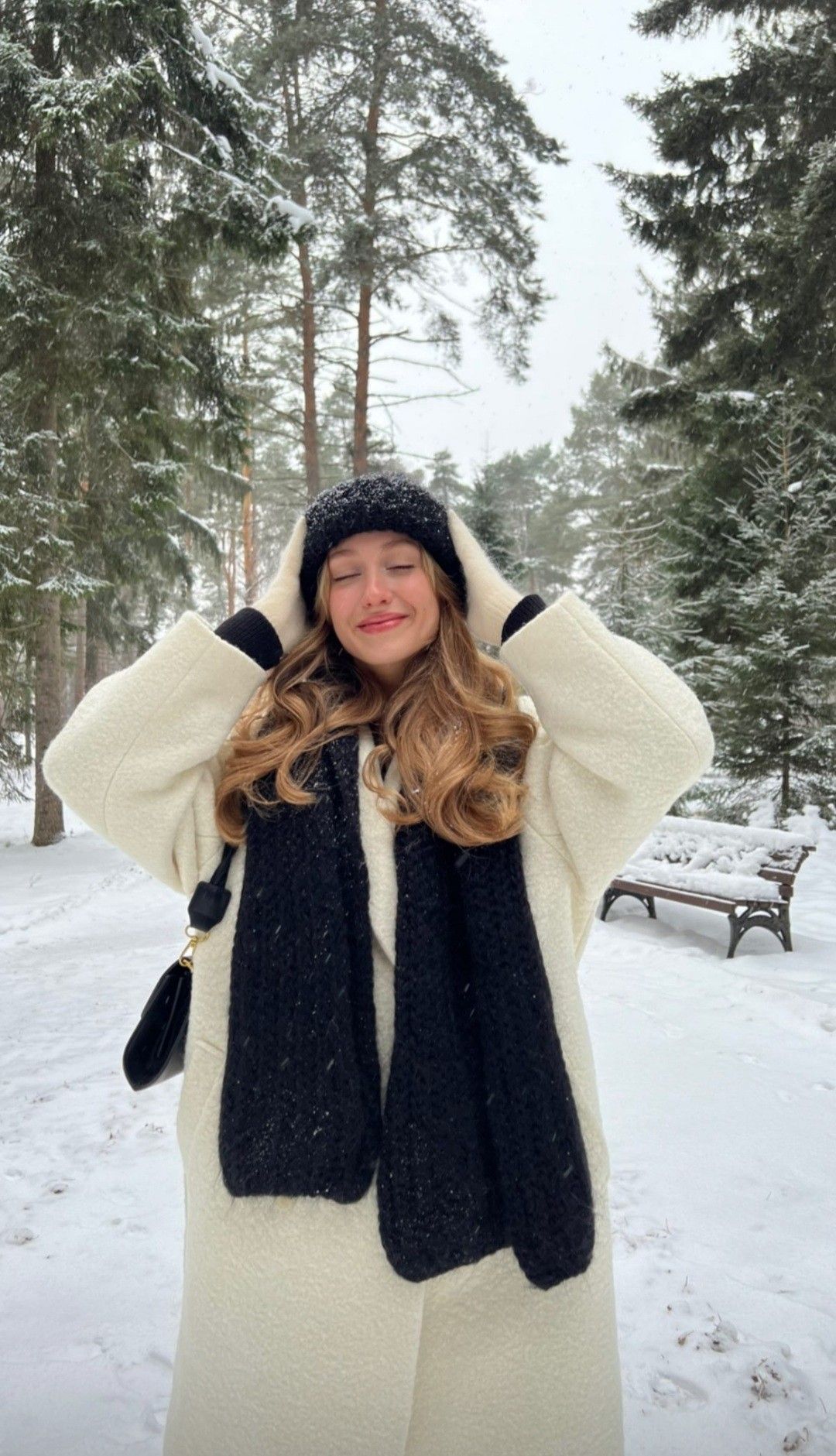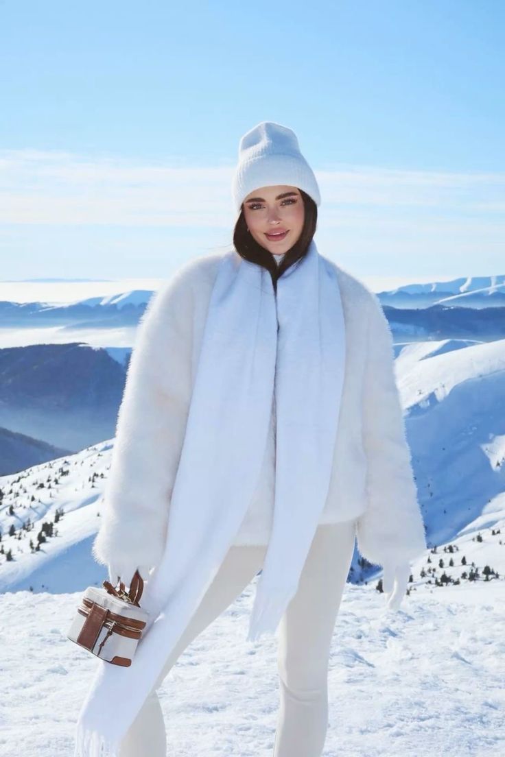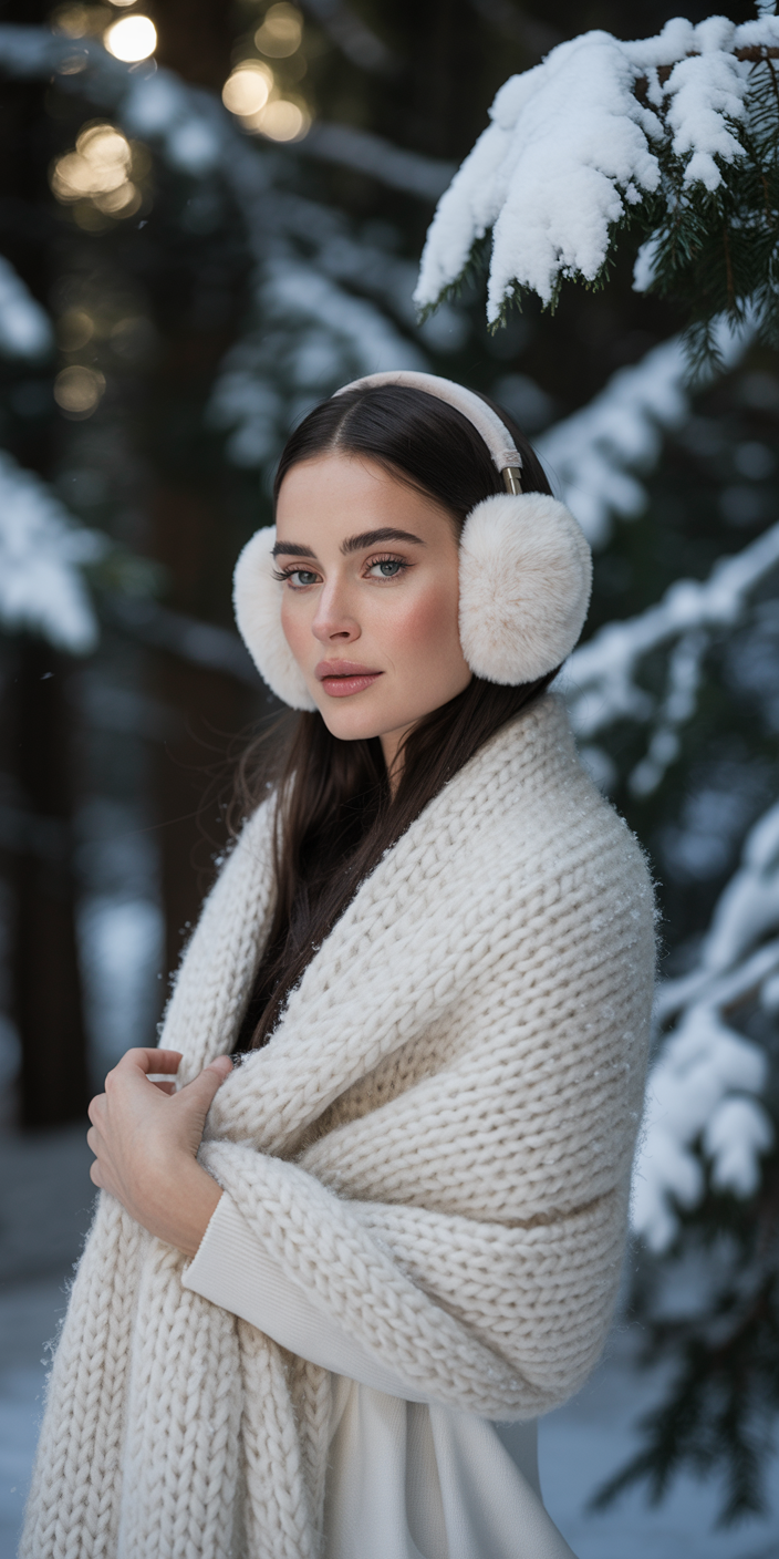 If minimalism had a winter anthem, this would be it — an all-white look so ethereal it feels like stepping into a snow globe. The soft-pile jacket and flowing scarf are cozy yet sculptural, and the fitted trousers lengthen the figure beautifully. Works best for medium length or long hair, especially curly textures that add contrast against the monochrome palette. This is the kind of outfit that photographs like a dream — think ski resorts, chalet terraces, or sunrise walks above the clouds.