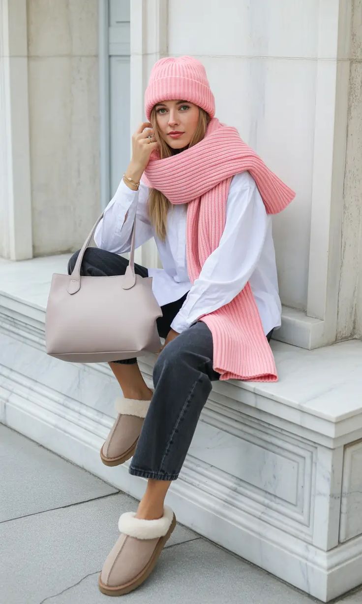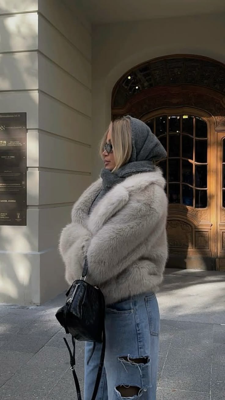 A true city classic — faux-fur jacket, grey hooded scarf, distressed denim, and a no-nonsense crossbody bag. It’s the cool-girl formula that makes short hair or tucked-in medium hair look effortlessly chic. The neutral color story — beige, grey, faded blue — adds calm confidence. This outfit balances structure and slouch, ideal for off-duty weekends or creative-office days.