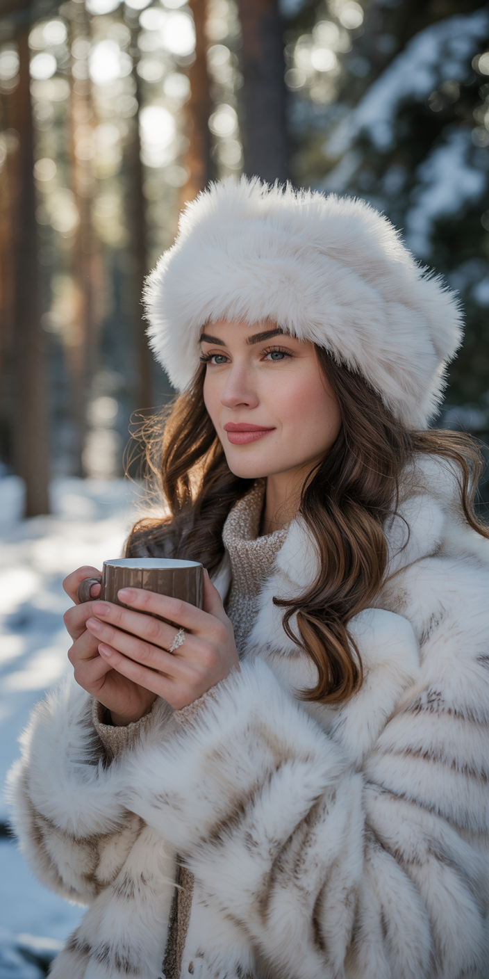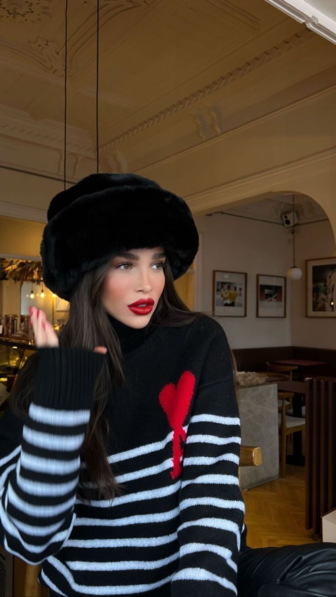 A black fur cap, red lipstick, and striped knit — the trifecta of winter seduction. There’s something unapologetically confident about it, a mix of cabaret glam and cozy intimacy. Best suited for long hair or medium hair, as the length helps soften the dramatic hat. Perfect for dinner dates, art galleries, or chic indoor soirées.