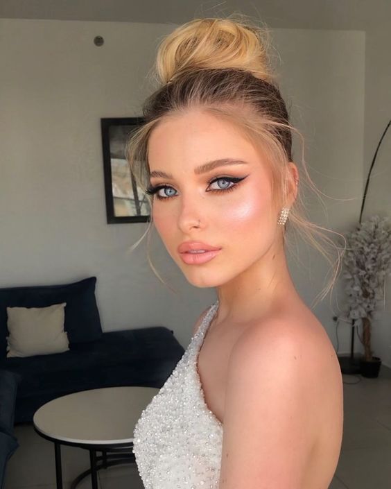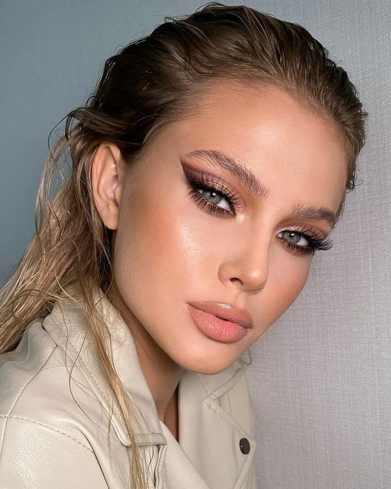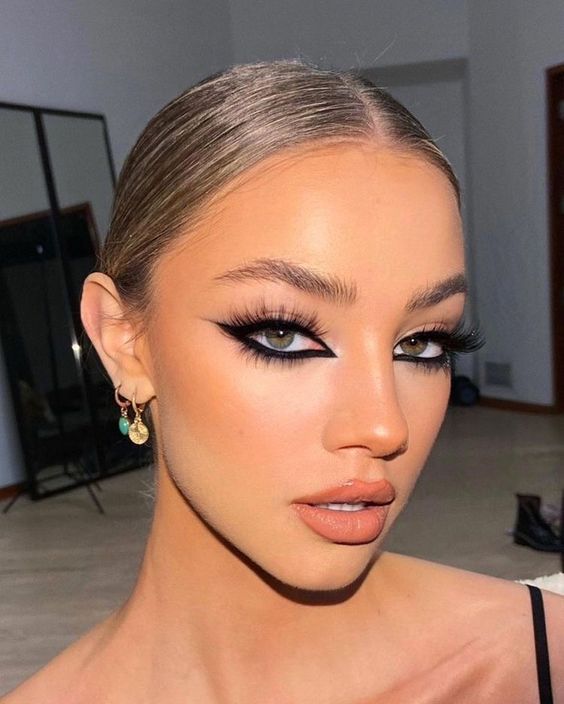 For those who love a bit of drama, this makeup look offers a glamorous edge with its glowing skin, bold eyeliner, and nude lips.