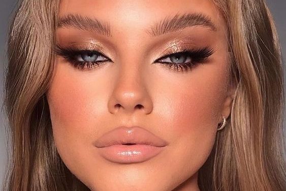 - Lips: A soft nude or peachy lip that complements the warmth of the eye makeup.