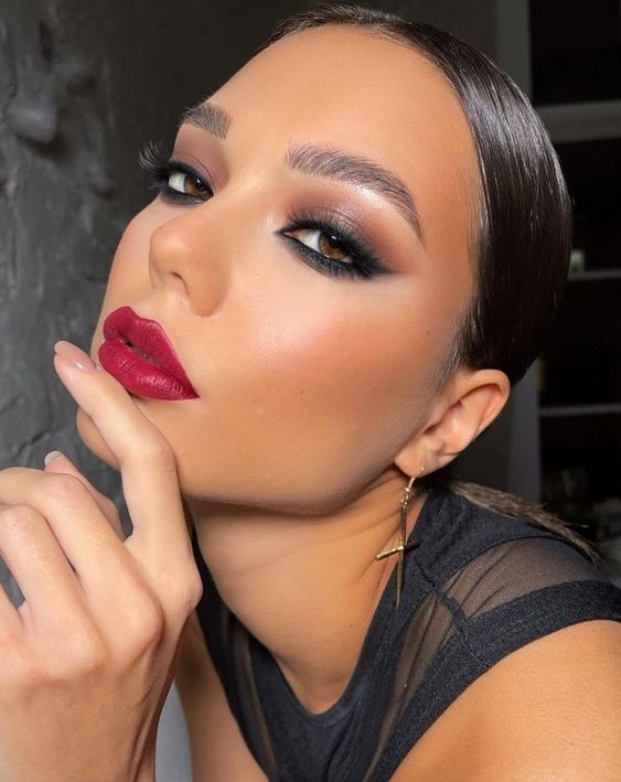 This look channels old Hollywood glamour with a modern twist. The deep red lips paired with sultry, smoky eyes create a timeless yet contemporary vibe.