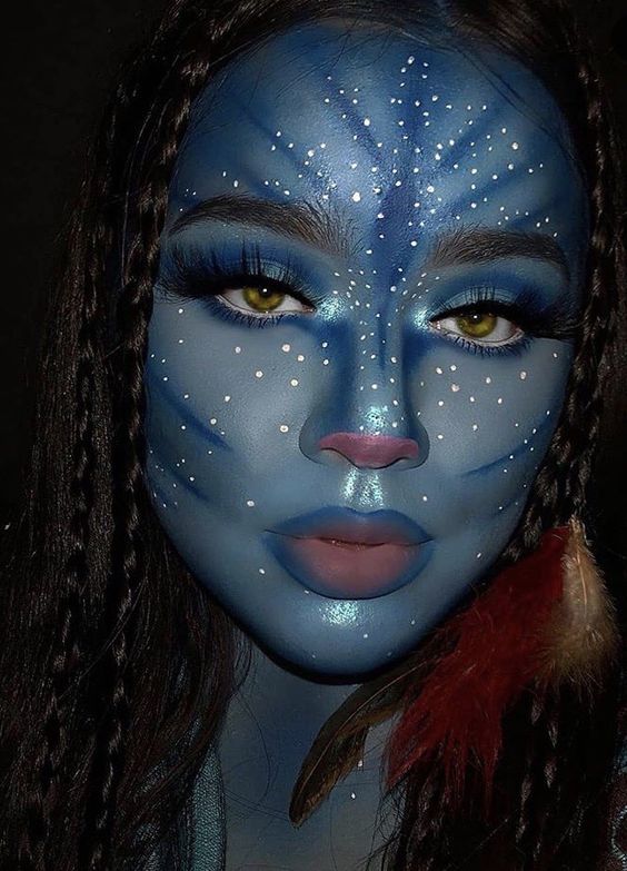 For those looking to channel their inner Na’vi from the movie “Avatar,” this makeup is both creative and amazing. The blue skin tone and intricate white dot patterns bring the alien aesthetic to life.