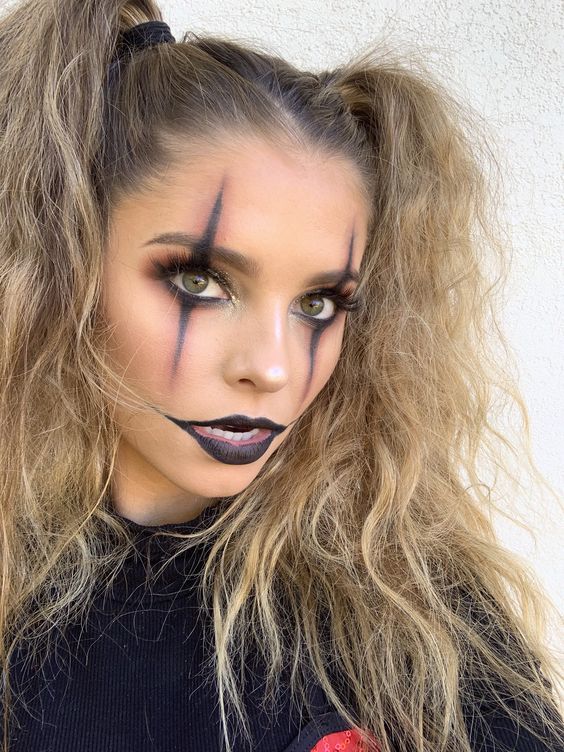 Nothing says Halloween like a sinister clown, and this makeup look hits all the right notes of playful and scary. The makeup emphasizes bold lines and dramatic effects that are both simple and impactful.