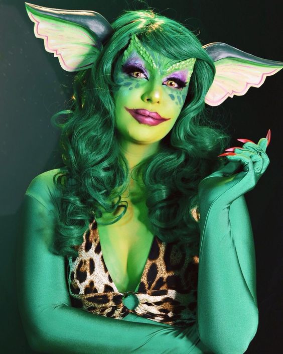 For a look that’s both amazing and creative, this glamorous gremlin makeup transforms a classic character into a stylish icon. It’s all about merging fantasy with high fashion.