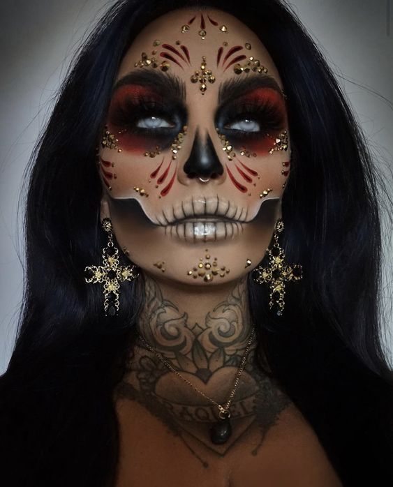 This look is the epitome of creative and terror all rolled into one. The intricate skull design features bold black lines and stunning gold embellishments that create a striking contrast against the pale base.
